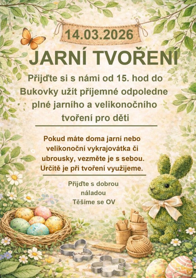 Přijďte si s námi od 15. hod do Bukovky užít příjemné odpoledne plné jarního a velikonočního tvoření pro děti.